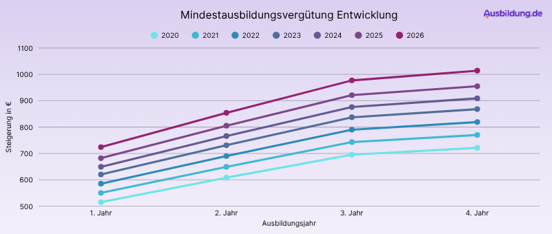 Im ersten Ausbildungsjahr liegt der Azubi-Mindestlohn bei 724 Euro brutto im Monat. Im zweiten Ausbildungsjahr steigt das Gehalt auf 854 Euro pro Monat und im dritten Jahr gibt es 977 Euro. Im vierten Ausbildungsjahr liegt die Mindestvergütung bei 1.014 Euro.