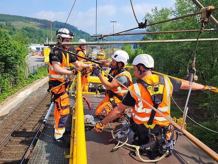 Wartung und Montage von Oberleitungen und Hochspannungsanlagen im Team auf unseren Bahnbaustellen