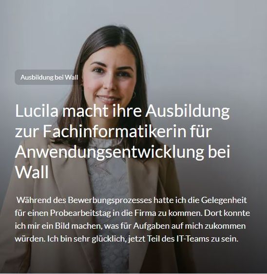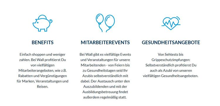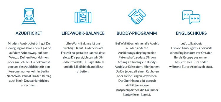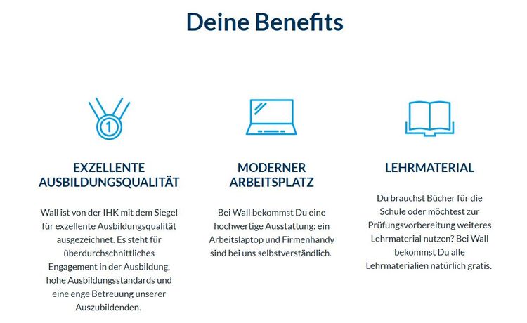 Du erhältst bei Wall viele Benefits wie z.B. das Azubiticket für den ÖPNV, Lehr- und Schulmaterial, einen begleitenden Englischkurs und 5 Tage Freistellung zur Prüfungsvorbereitung on top.