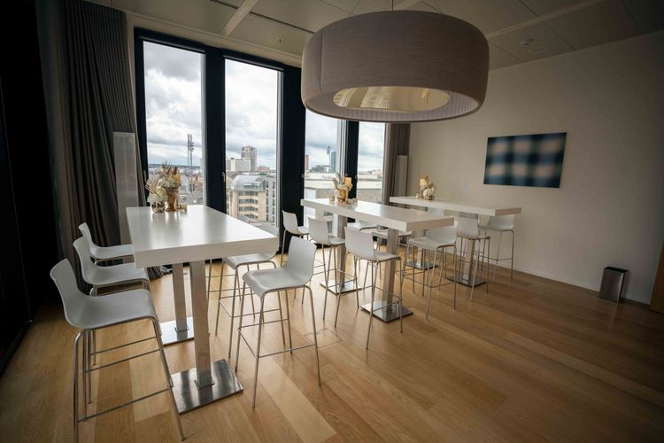 Dachterrasse mit Blick auf die Frankfurter Skyline und Mitarbeiterlounge mit Pac-Man, Tischkicker und Nintendo Switch