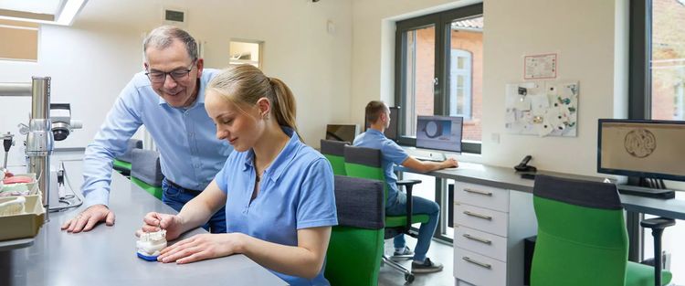 Als Zahntechniker/-in fertigst Du für unsere Kunden/Zahnärzte und deren Patienten Zahnersatz an. Arbeitsgrundlage sind Abdrücke von Zähnen des Patienten und Auftragsbeschreibungen. Dabei kann es sich um kleinere Arbeiten wie Kronen oder Brücken, um ein komplettes künstliches Gebiss oder komplexe Zahnersatzlösungen auf Implantaten handeln. Auch die digitale Komponente kommt in diesem Berufsbild nicht zu kurz und entwickelt sich stets weiter. Computergesteuerte Software und 3D-Scans unterstützen die Zahntechniker/innen bei der Herstellung von Zahnersatz und machen sie noch präziser.