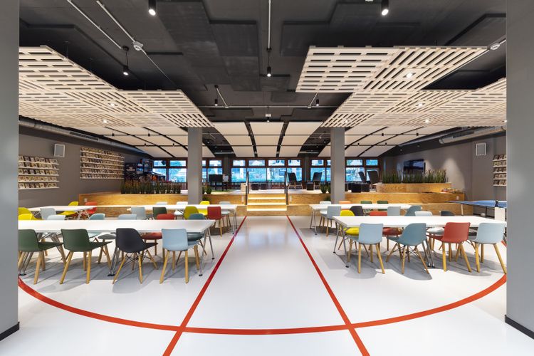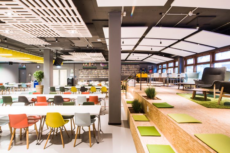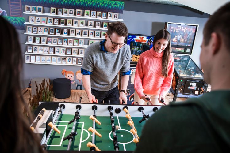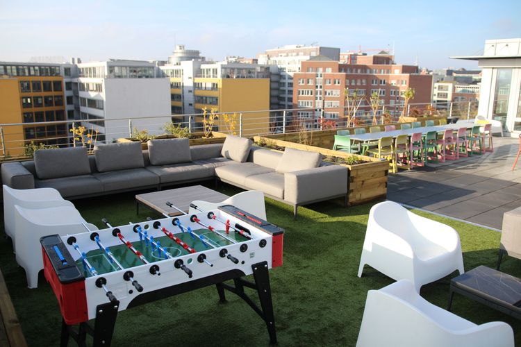 Modernes und gemütliches Büro. Wir bieten Dir diverse Möglichkeiten Arbeit und Wohlbefinden miteinander zu vereinbaren: frisches Obst und kostenlose Getränke, hauseigenes Fitnessstudio, Gaming-Bereich, Dachterrasse mit BBQ, Relaxing-Rooms und vieles mehr.