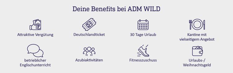 Du durchläufst eine 3-jährige Ausbildung mit spannenden und abwechslungsreichen Aufgaben. ADM WILD zeichnet sich durch eine persönliche Atmosphäre und ein gutes Zusammengehörigkeitsgefühl unter den Kollegen aus. Wir bieten Dir eine intensive Betreuung, wobei uns Deine persönliche und fachliche Entwicklung sehr wichtig ist. Im Rahmen Deiner Ausbildung erhältst Du zusätzlich Englischunterricht und kannst an weiteren innerbetrieblichen Schulungen teilnehmen. Bei einem guten Abschluss hast Du bei ADM WILD auch nach Deiner Ausbildung die besten Perspektiven