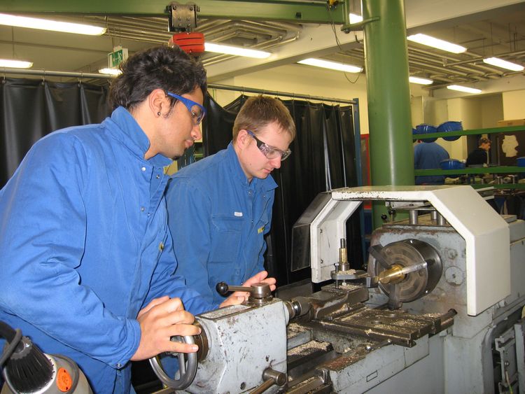 Unsere Industriemechaniker sind „Metallliebhaber, Schrauber und Tüftler“. Metall wird in allen Varianten bearbeitet. Das beginnt mit einer technischen Zeichnung. Sie sollten daher keine Angst vor dem Umgang mit Zirkel und Geodreieck haben. Danach wird gerechnet: Formeln, Volumen, Umfang, Winkel, Dreisatz, Pythagoras. Schließlich wird ausreichend Material benötigt und das Werkstück soll so aussehen wie auf der Zeichnung. Dann wird gebogen, gebohrt, gefeilt und geschweißt bis das Produkt exakt der Zeichnung entspricht und eingebaut werden kann. Chemisches und technisches Verständnis sind ebenfalls wichtig. Neben der reinen Metallbearbeitung gehören auch Wartung, Inspizierung und Instandsetzung sowie Pneumatik und Hydraulik zu den wesentlichen Inhalten der praxisnahen Ausbildung.